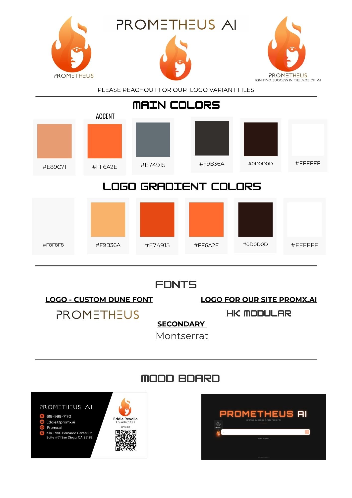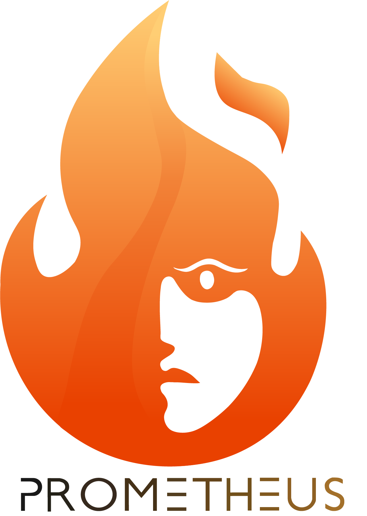 Created a flame style mark symbolizing the greek fire god Prometheus, implemented an orange gradient and added an ominous face to hint at cutting edge tech. Font was pre-picked by client.